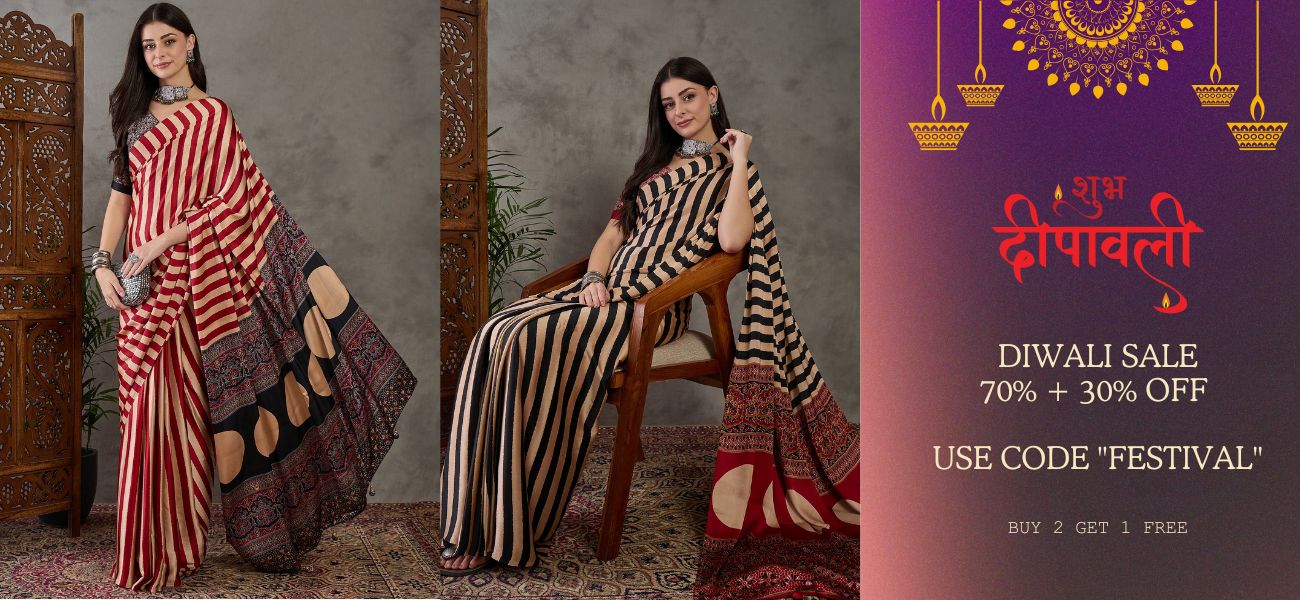 Sonali Kulkarni Inspired: Buff Cream Stripe Ajrakh Printed Satin Gaji Silk Saree