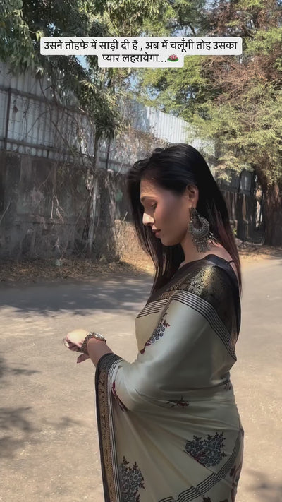 Drape yourself in timeless artistry with our Wheat Cream and Black Printed Satin Crepe Silk Saree, a perfect blend of tradition and elegance. The smooth and lightweight fabric feels gentle on the skin, making it comfortable to wear for long hours. Beautifully detailed prints add a touch of modern charm while maintaining a classic look, making it perfect for casual outings, office wear, festive gatherings, and small celebrations.