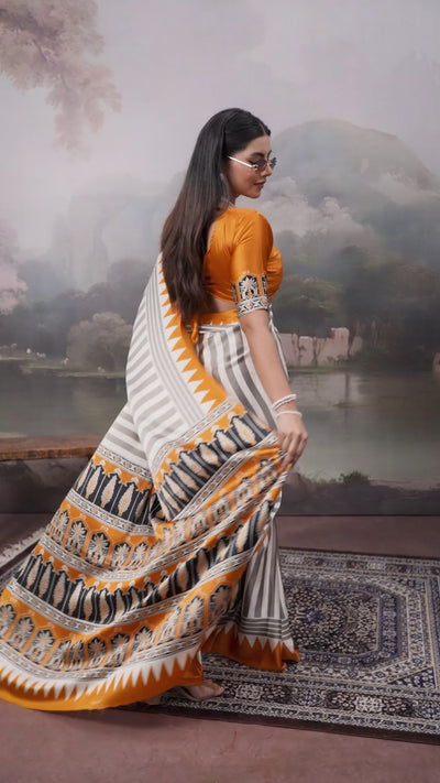 Bone White and Yellow Ajrakh Printed Satin Crepe Silk Saree