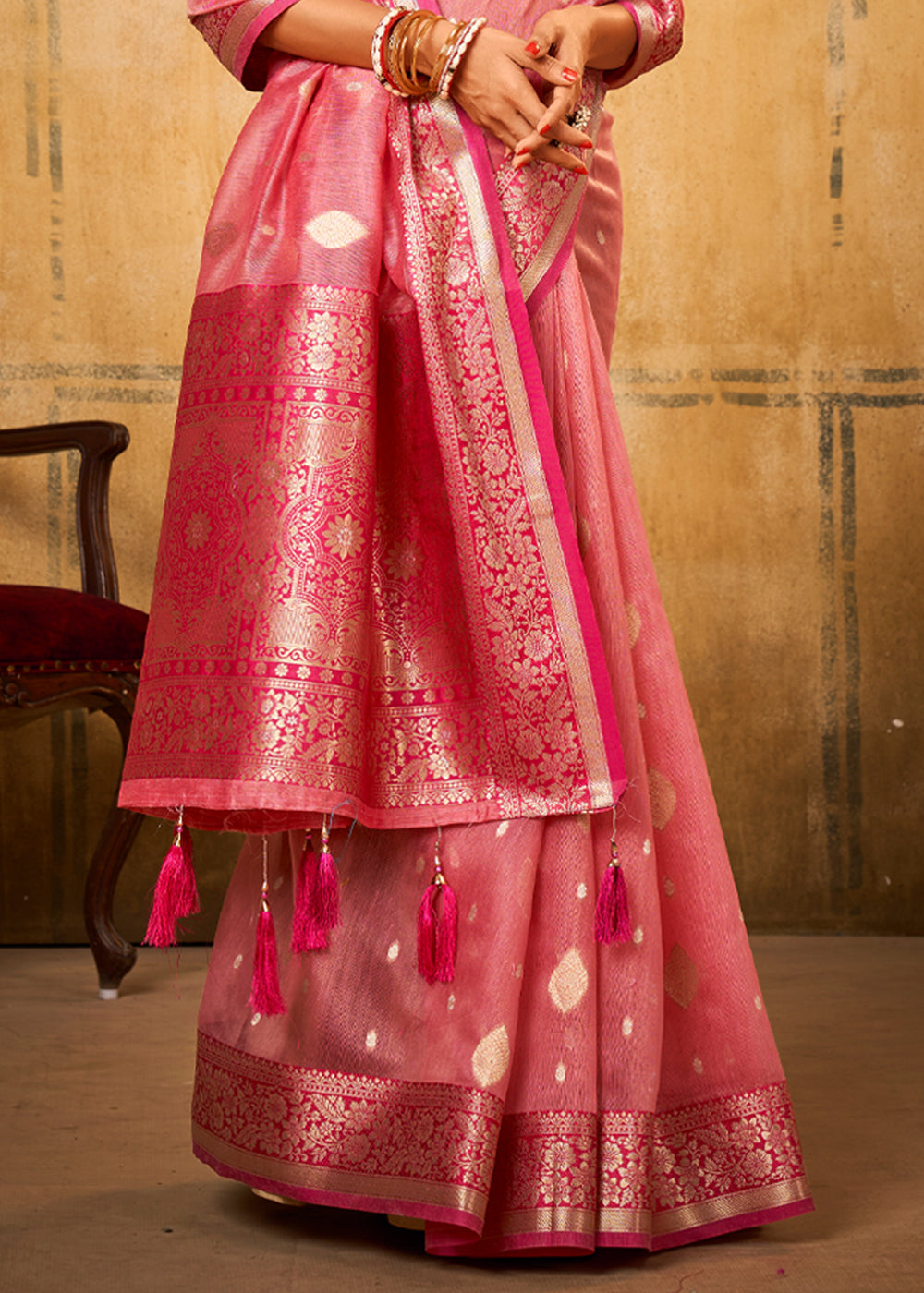 This Brink Pink Woven Banarasi Silk Saree exquisite saree is a must-have in your wardrobe, as it flaunts a graceful Banarasi pattern in this colour which enhances the colour of the saree. This saree is made with a beautiful silk that creates an elegant look. It is truly an absolute treasure of a saree, which blends fashion and class to the finest degree.