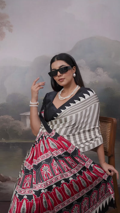 Cornsilk White and Black Ajrakh Printed Satin Crepe Silk Saree