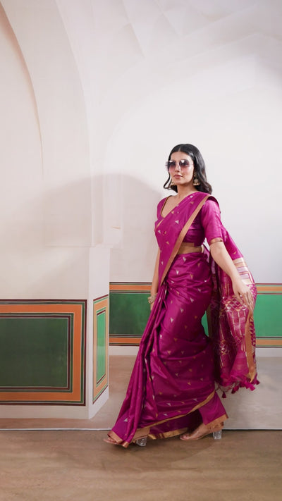 The Violet Purple Tussar Handloom Silk Saree showcases the raw beauty and rich texture of natural silk. Handwoven with care, it features a subtle sheen and earthy elegance that reflects timeless craftsmanship. Lightweight yet luxurious, this saree drapes beautifully and feels comfortable all day. Perfect for festive occasions, cultural events, and graceful everyday wear.
