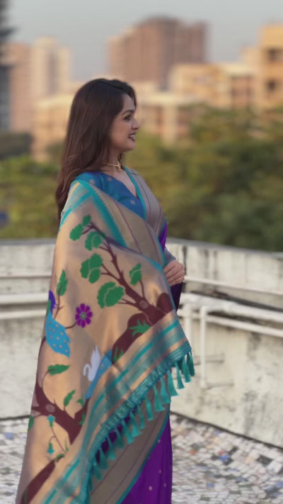 This exquisite Violet Purple Zari Woven Paithani Saree is a celebration of timeless tradition and royal craftsmanship. Adorned with delicate gold zari small motifs spread gracefully across the body, it exudes subtle luxury and charm. The highlight of the saree is its rich contrast woven Swan meenakari fancy Paithani pallu, showcasing intricate artistry and vibrant detailing. Finished with a classic traditional border and paired with a matching contrast brocade blouse as shown, this saree is perfect for weddings, festive occasions, and grand celebrations.